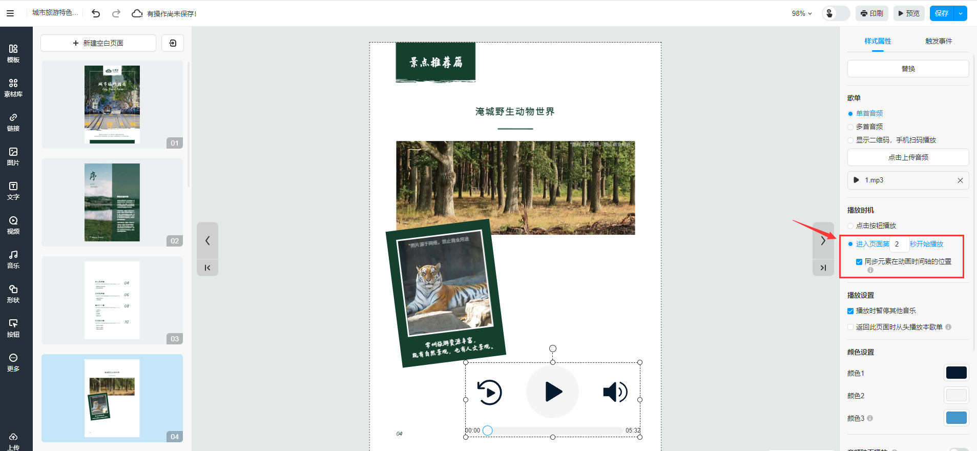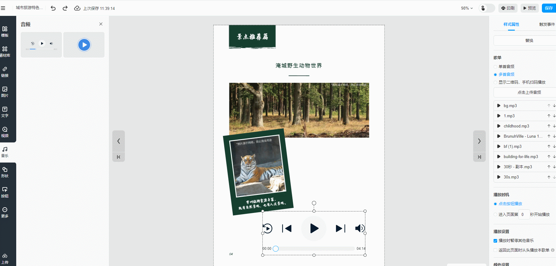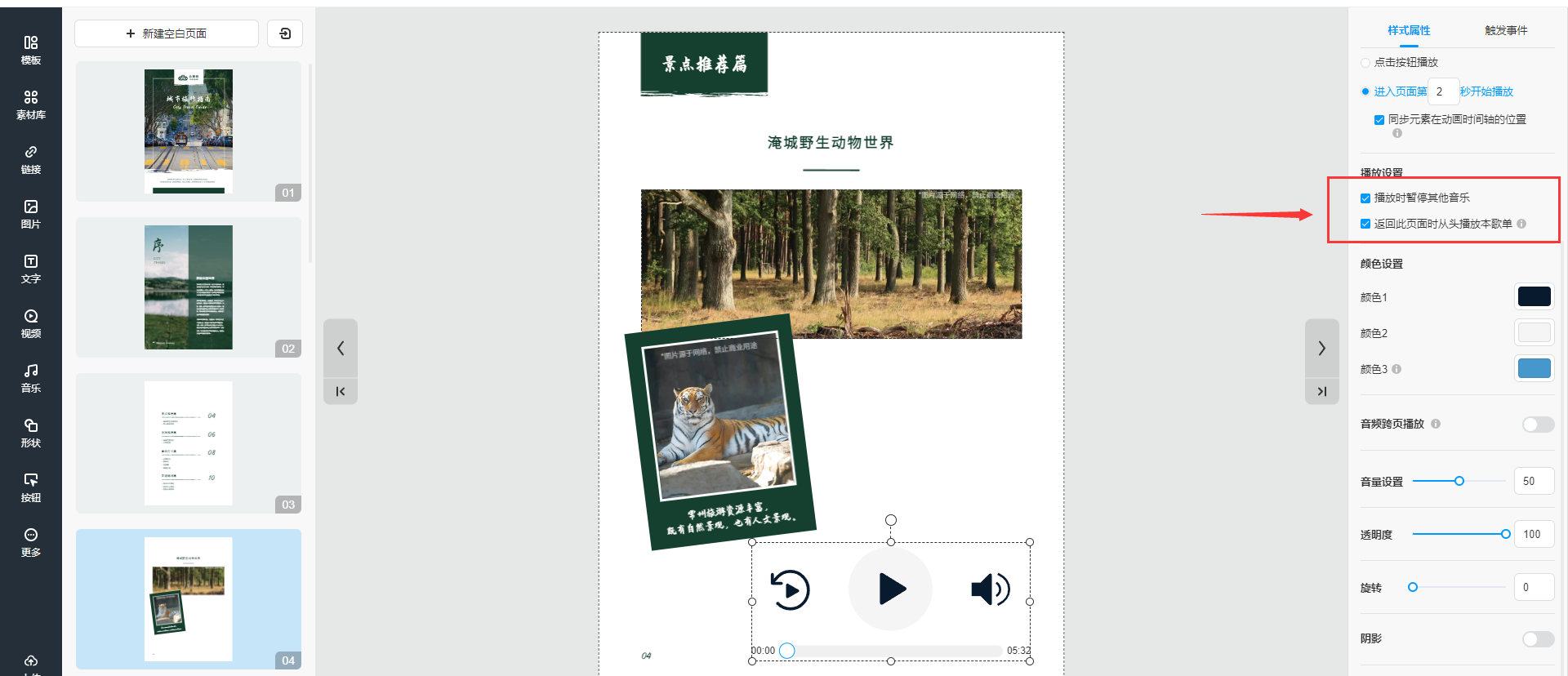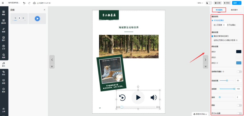 根據(jù)你的需求,在屬性面板中你可以上傳音樂,設置音樂播放方式,自定義音樂控件的顏色、陰影、位置大小以及旋轉。
