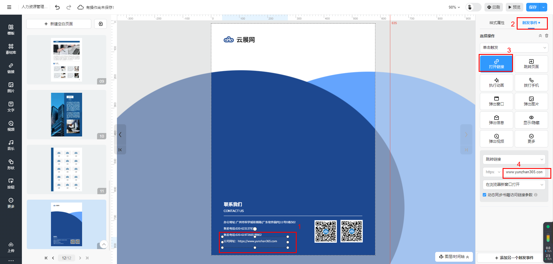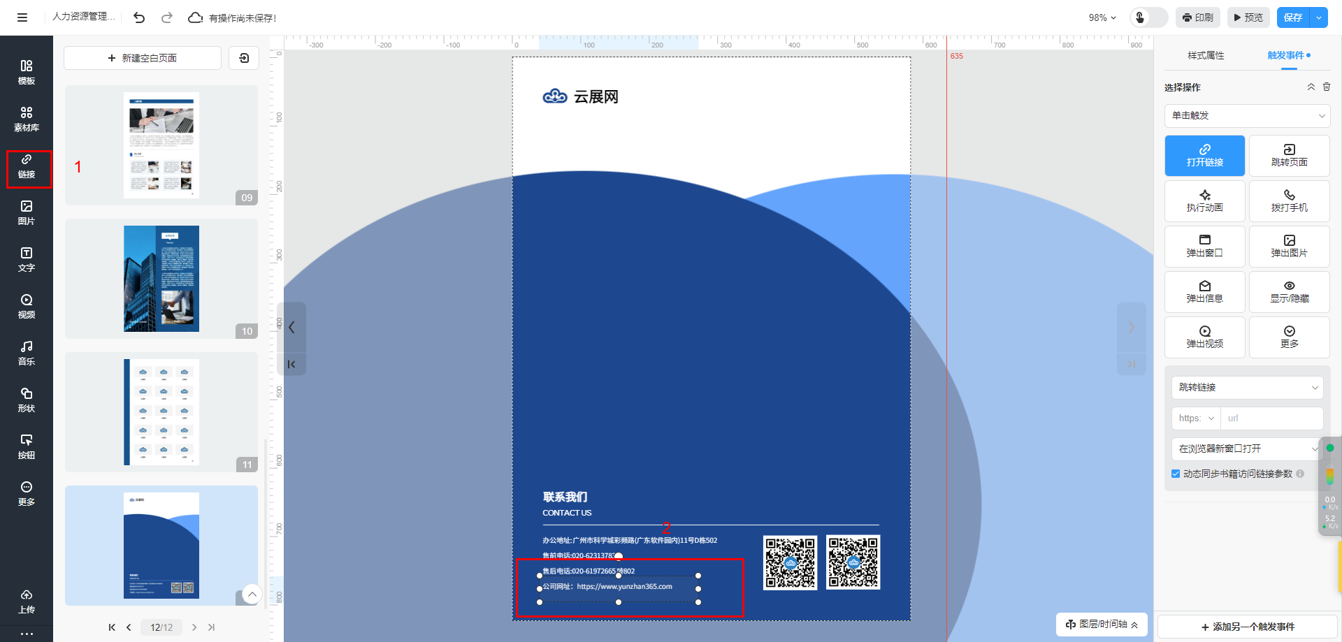 (2)在右邊設(shè)置面板,點擊【觸發(fā)事件】,選擇【打開鏈接】動作并且輸入跳轉(zhuǎn)鏈接。