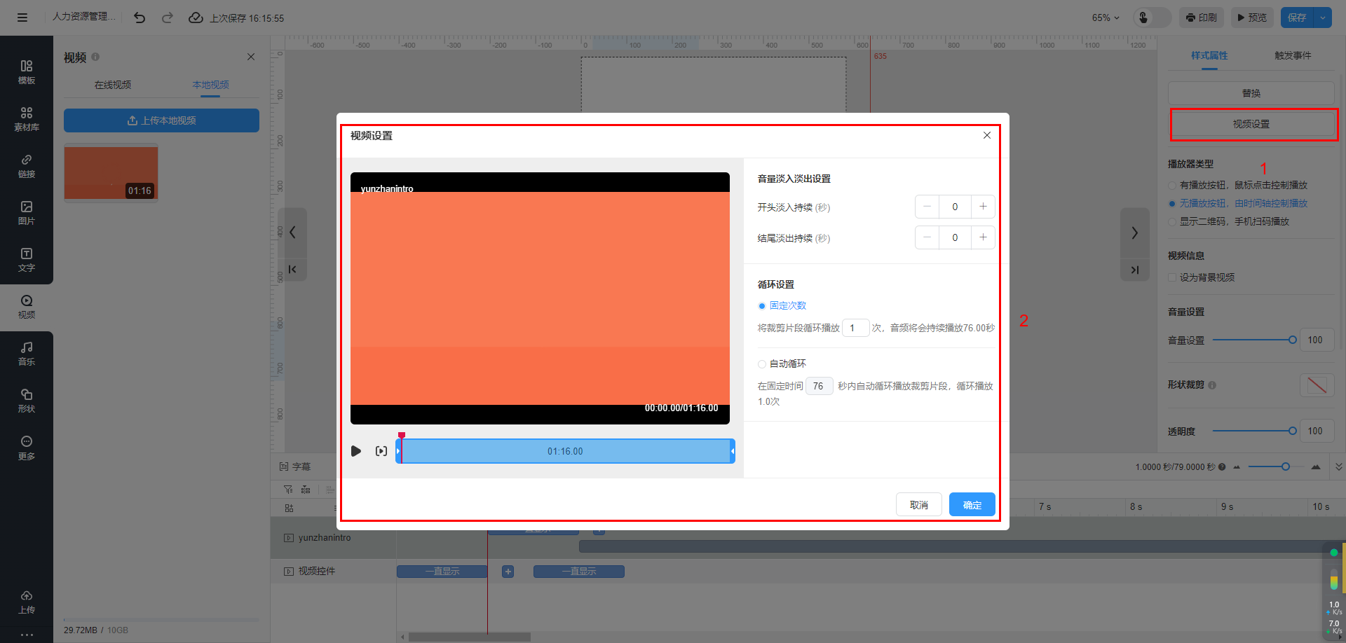 溫馨提示:【無(wú)播放按鈕,由時(shí)間軸控制播放】?jī)H支持上傳本地視頻類型勾選。