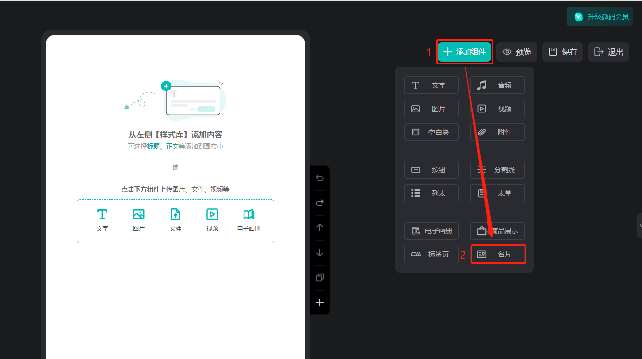 點(diǎn)擊【添加組件】,選擇【名片】。