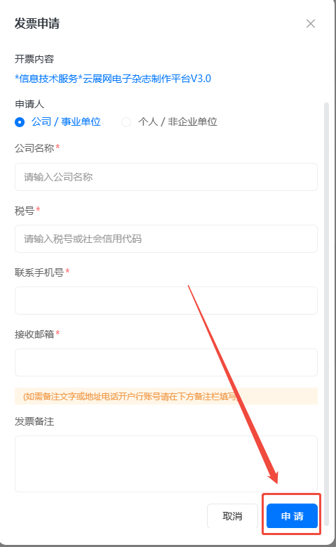 3、選擇發(fā)票類型,然后填寫相關(guān)信息,如需在發(fā)票右下角備注文字或者補充地址電話開戶行賬號的,請在發(fā)票備注欄上填寫,信息要確保無誤,避免影響報銷,填好以后下滑點擊【申請】。