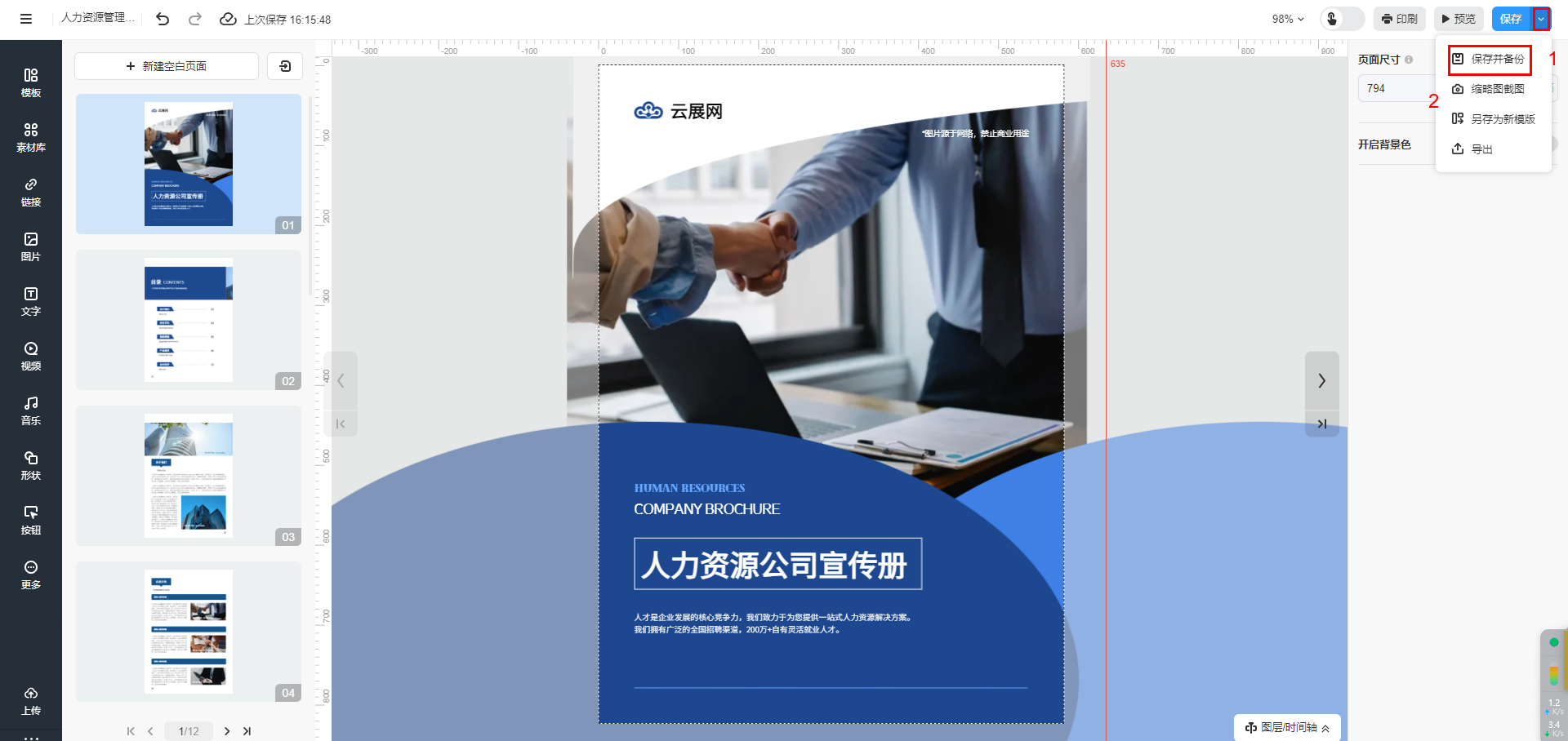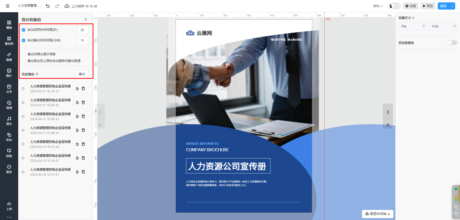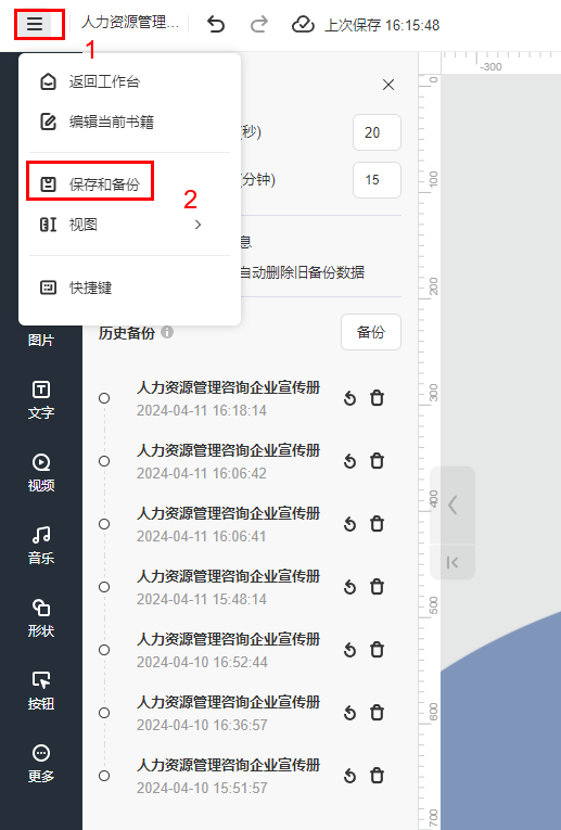 所有設(shè)置完成以后,在多媒體編輯器右上角點擊【保存并備份】。