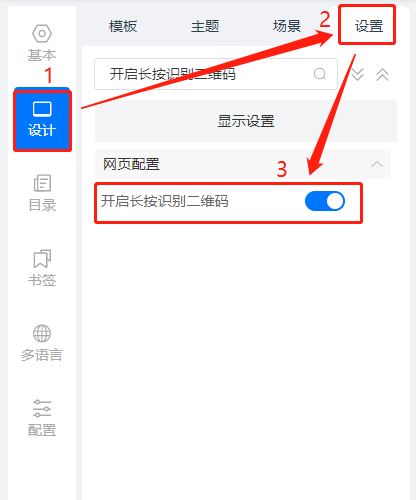 點擊【設(shè)計】,然后點擊【設(shè)置】,打開【開啟長按識別二維碼】。
