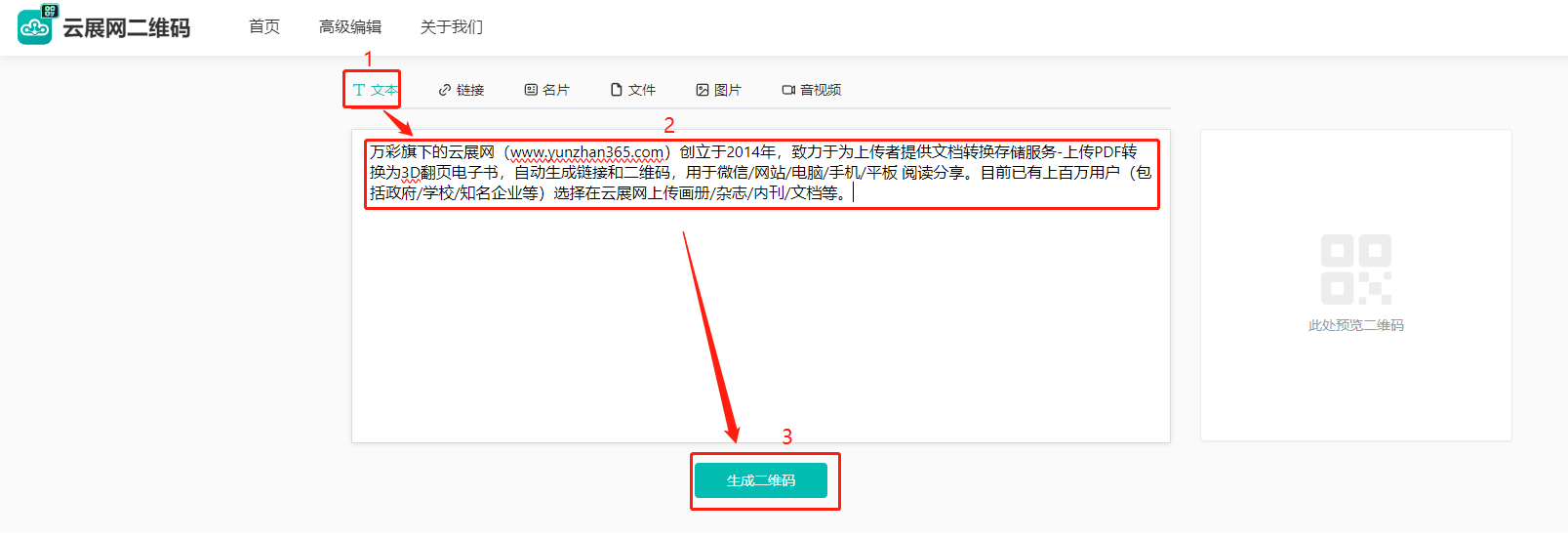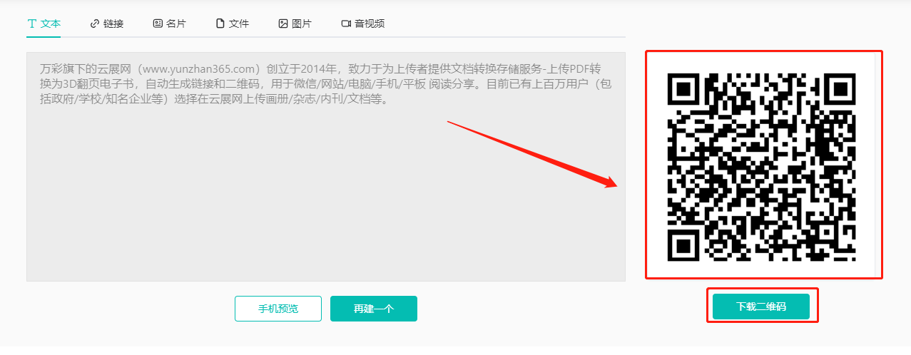 (1)點(diǎn)擊【文本】,下方輸入文案,點(diǎn)擊【生成二維碼】。