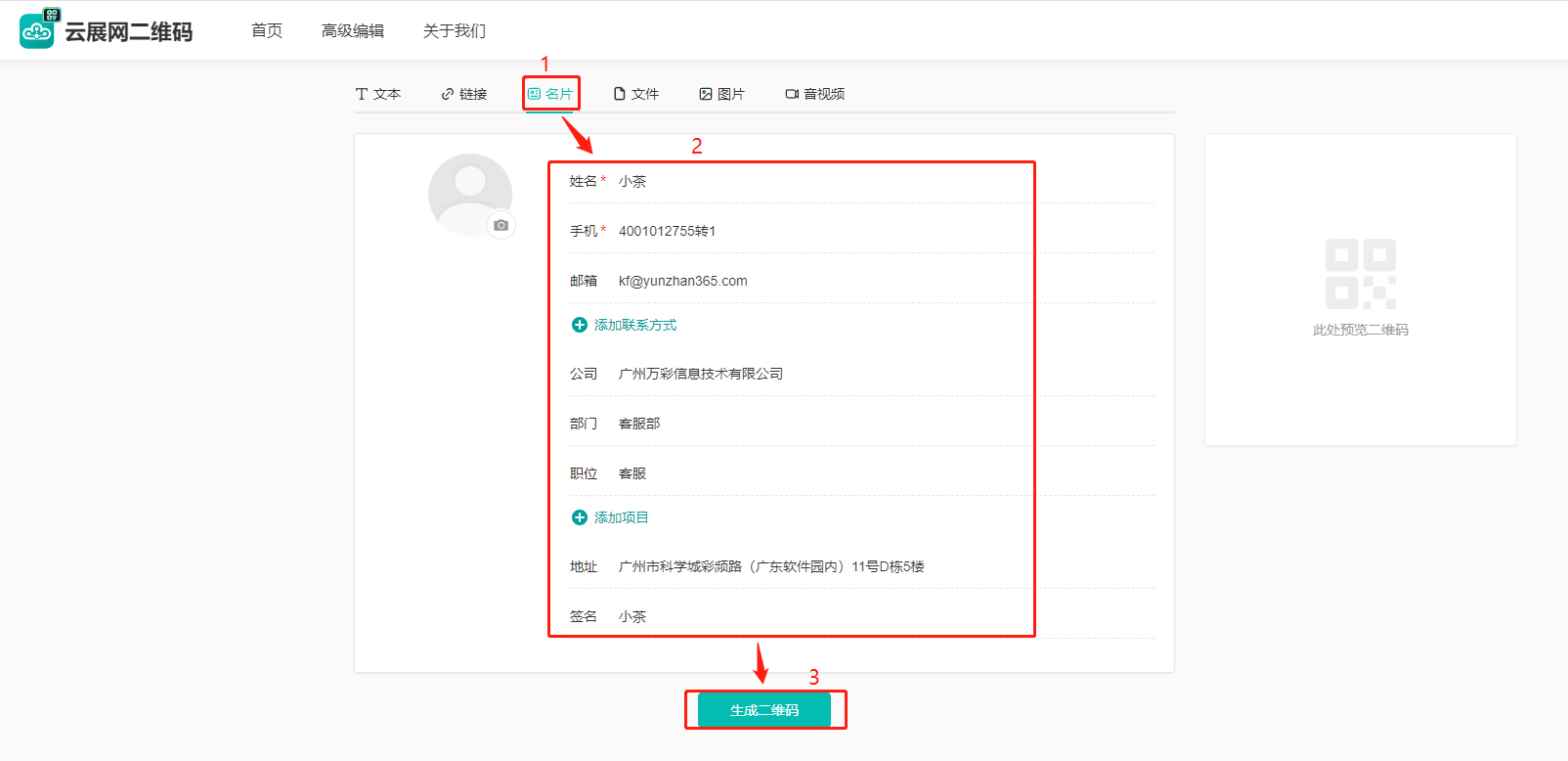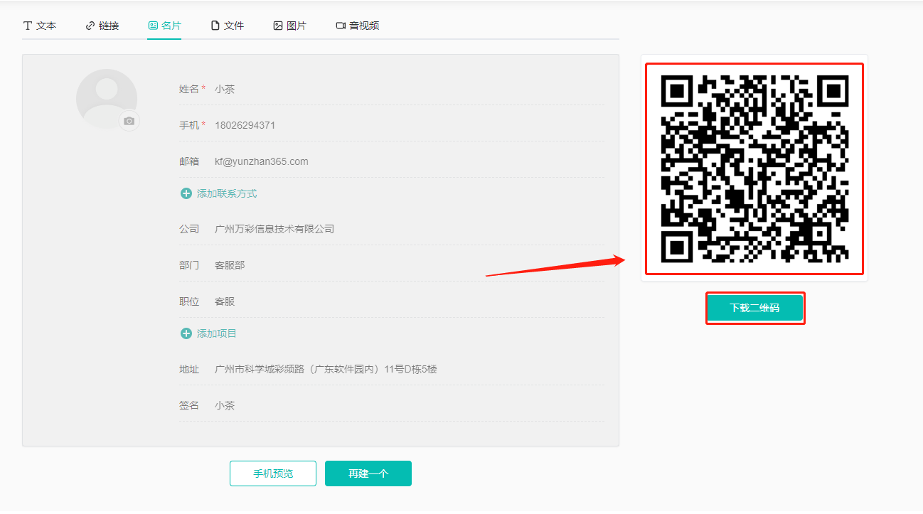 (1)點(diǎn)擊【名片】,下方輸入名片信息,點(diǎn)擊【生成二維碼】。