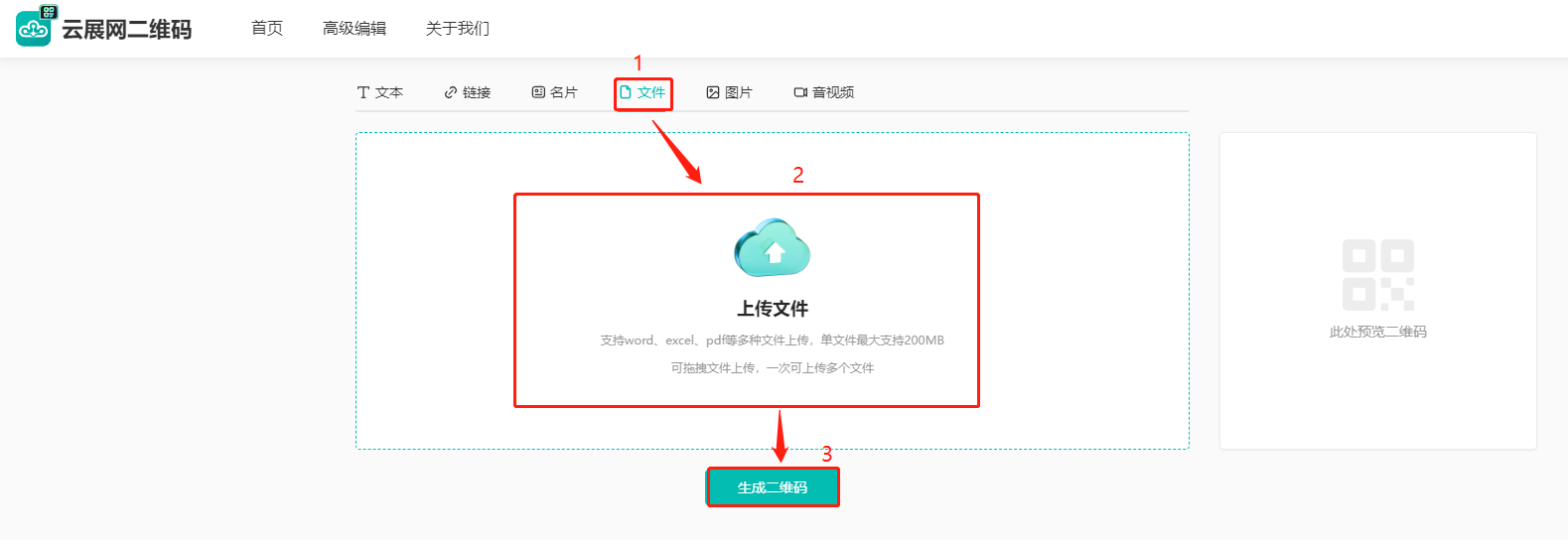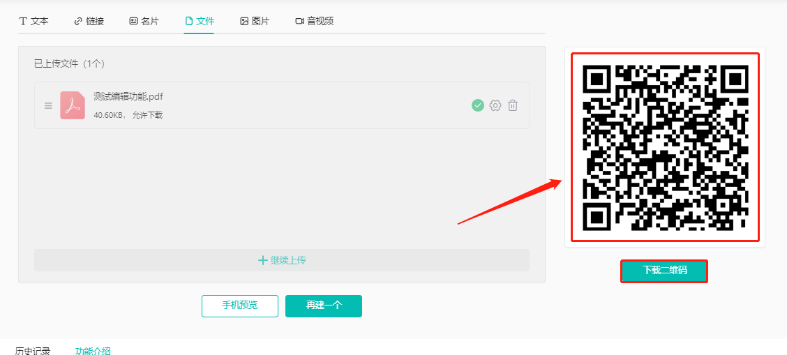 (1)點(diǎn)擊【文件】,然后點(diǎn)擊下方【上傳文件】上傳文件,點(diǎn)擊【生成二維碼】。