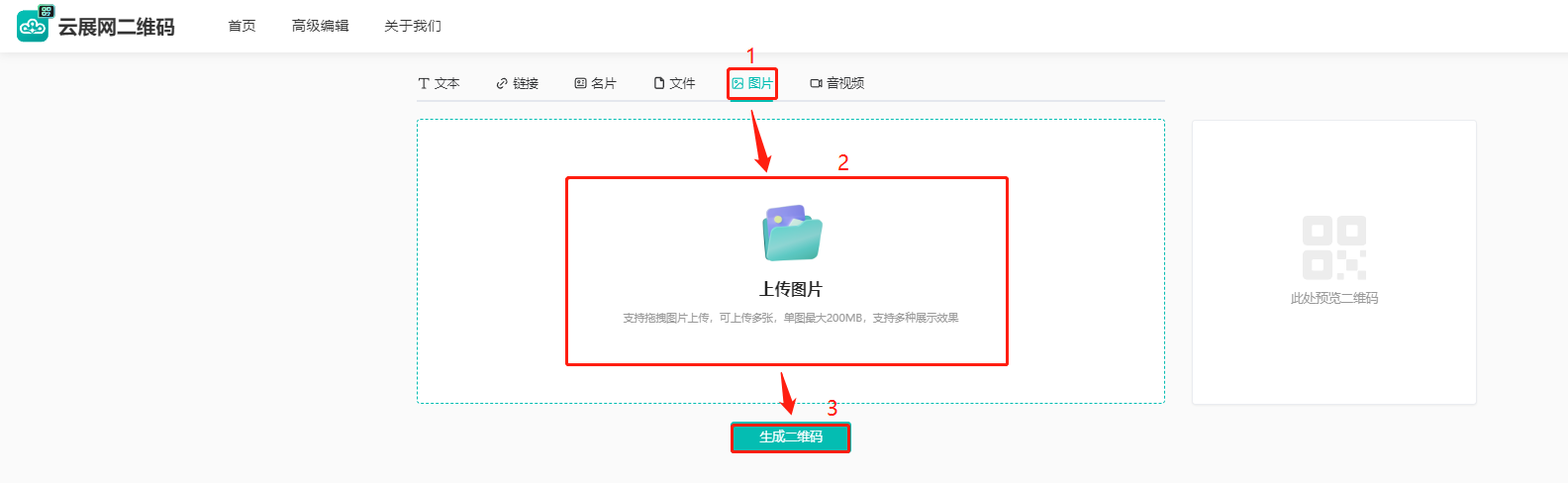 (1)點(diǎn)擊【圖片】,然后點(diǎn)擊下方【上傳圖片】上傳圖片,點(diǎn)擊【生成二維碼】。