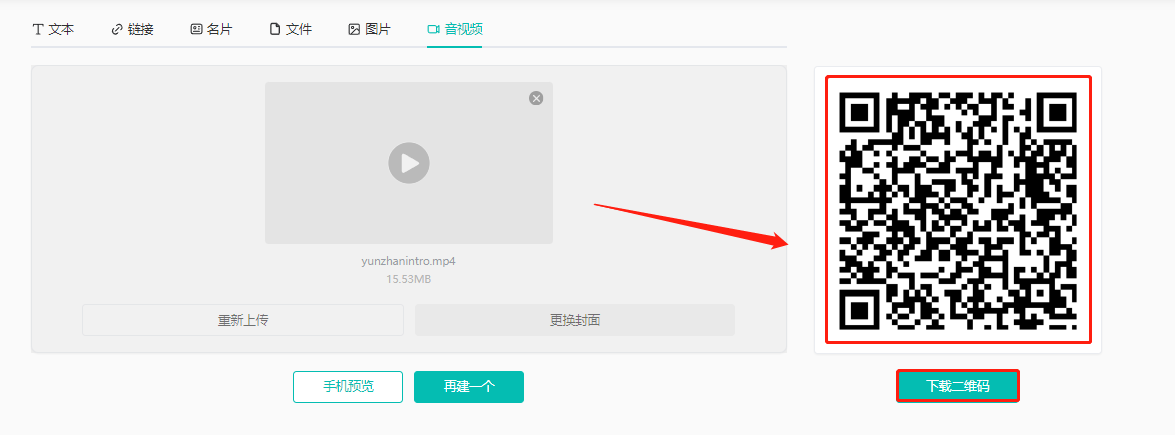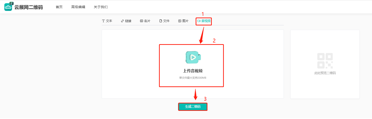 (1)點(diǎn)擊【音視頻】,然后點(diǎn)擊下方【上傳音視頻】上傳音頻或者視頻文件,點(diǎn)擊【生成二維碼】。