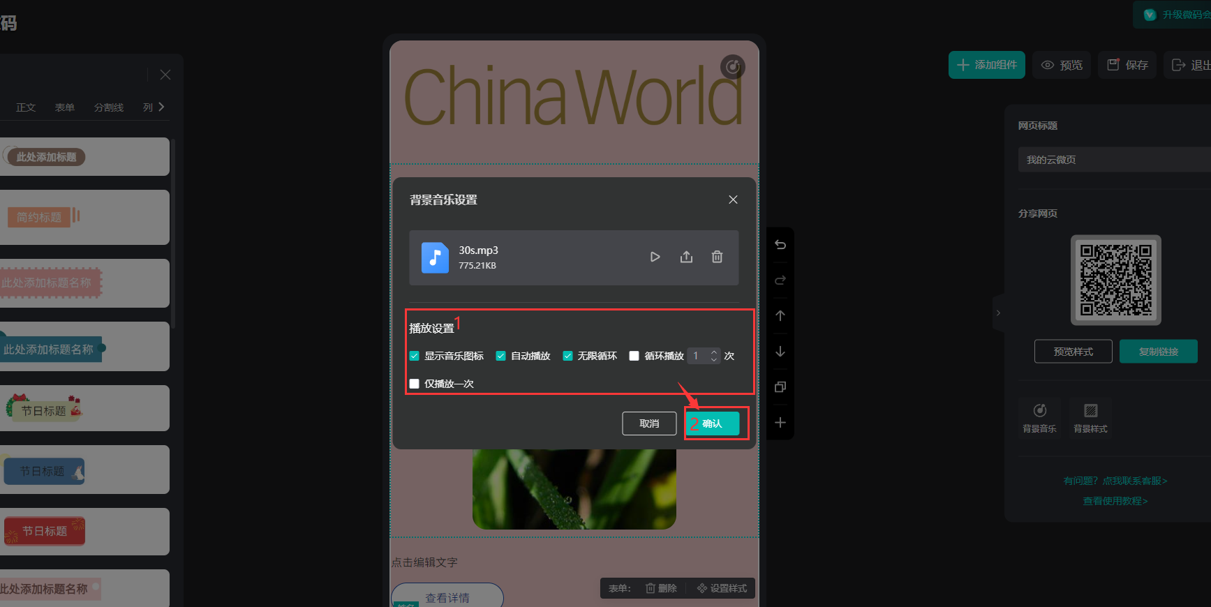 【循環(huán)播放多少次】:設(shè)置播放多次背景音樂(lè),比如設(shè)置2次,打開(kāi)微碼可播放2次背景音樂(lè)