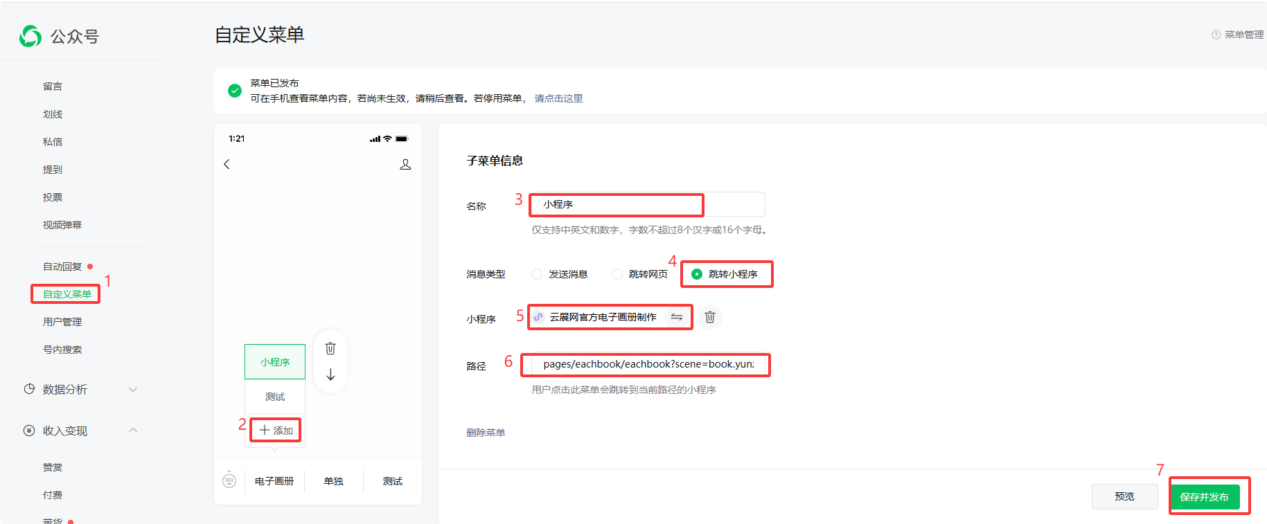 2、打開【自定義菜單】,點擊【添加】設置子菜單,輸入名稱,消息類型選擇跳轉小程序,選擇云展網官方電子畫冊制作小程序,輸入路徑地址