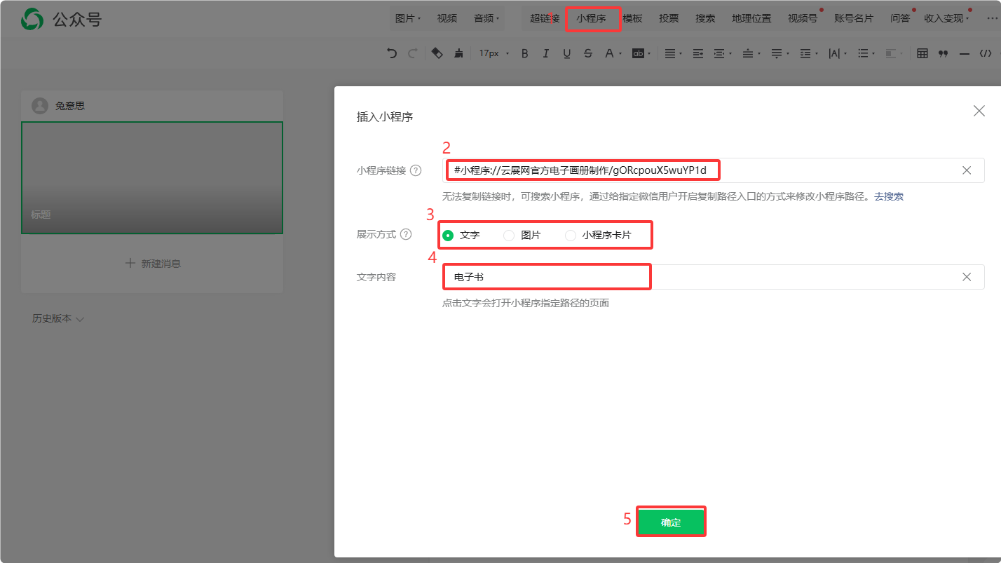2、編輯公眾號文章時,點一下頁面上的【小程序】,輸入小程序鏈接,選擇展示方式等,然后確定